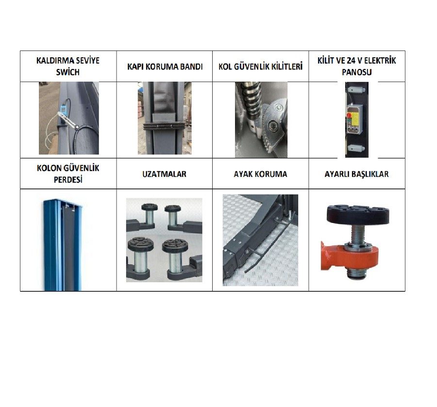 Tam otomatik kilit sistemi, senkronize kaldırma mekanizması ve acil durdurma özelliği ile kullanıcı güvenliğini en üst seviyede tutar. 4 ton taşıma kapasitesi, sağlam çelik gövde, aşınmaya dayanıklı hidrolik hortumlar ve uzun ömürlü motor yapısı sayesinde yoğun servis kullanımına uygundur. Elektrik kesintilerine karşı emniyet kilidi ve kontrollü indirme sistemi ile güvenli çalışma sağlar.