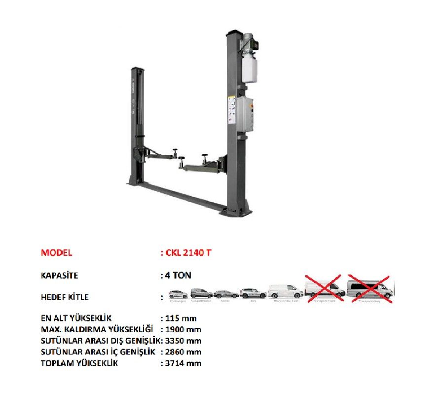 CKL 2140 T 4 Ton Tam Otomatik Hidrolik Lift, oto servisleri, bakım-onarım atölyeleri ve profesyonel işletmeler için tasarlanmış yüksek güvenlikli ve dayanıklı bir araç kaldırma sistemidir. 4 ton taşıma kapasitesi ile binek araçlar, kompakt sınıf, kombi, SUV ve minibüs (kısa kasa) araçlarda güvenle kullanılabilir. Uzun ve kısa transporter araçlar için uygun değildir.