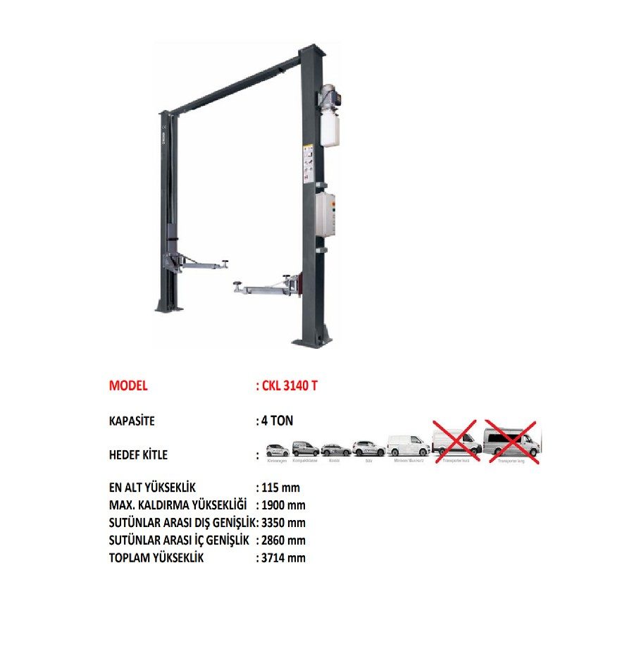CKL 3140 T 4 Ton üstten bağlantılı tam otomatik hidrolik lift, yüksek güvenlik donanımları, teleskopik kol sistemi ve 2 yıl garantisiyle profesyonel oto servisler için ideal çözümdür.