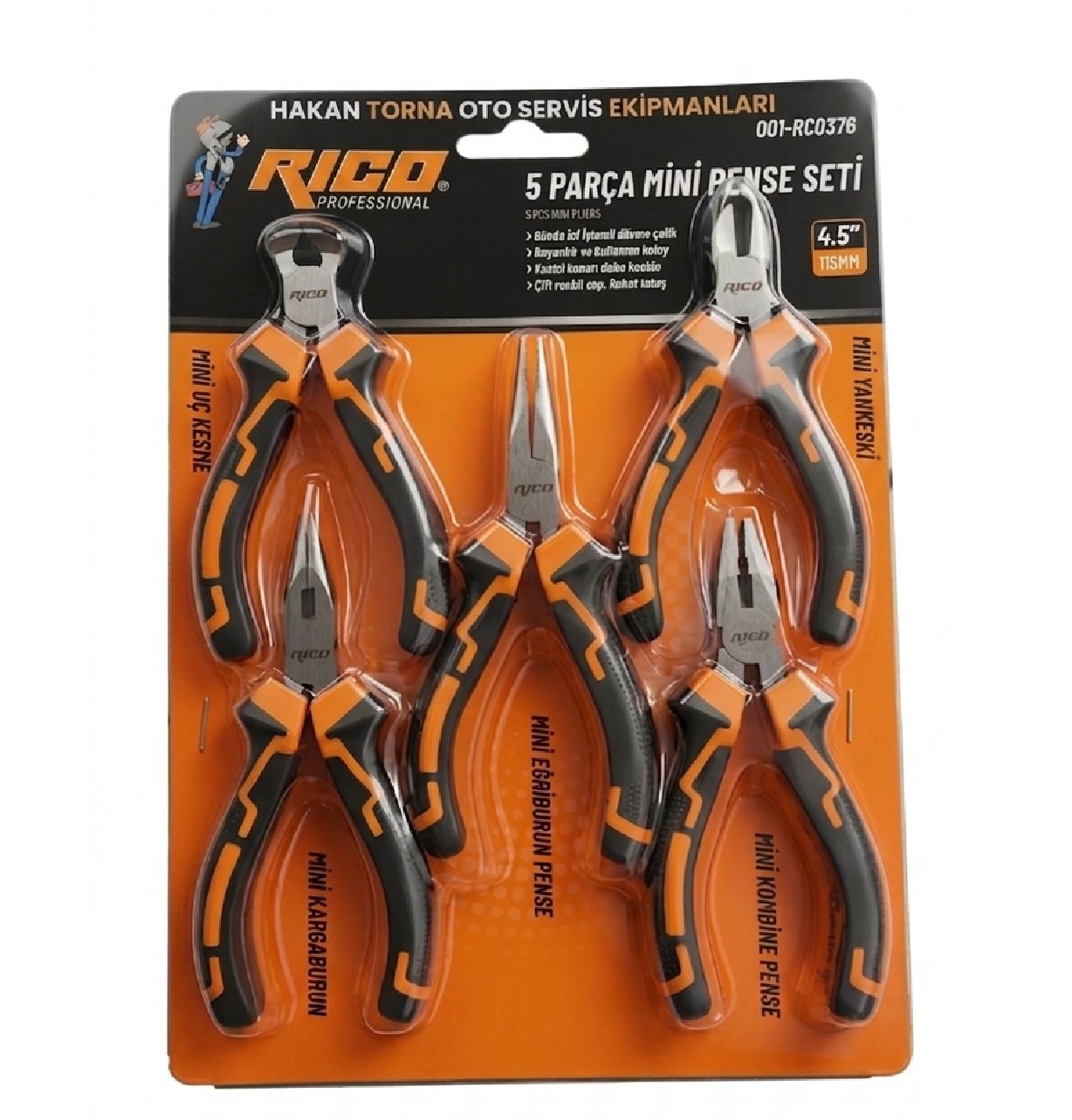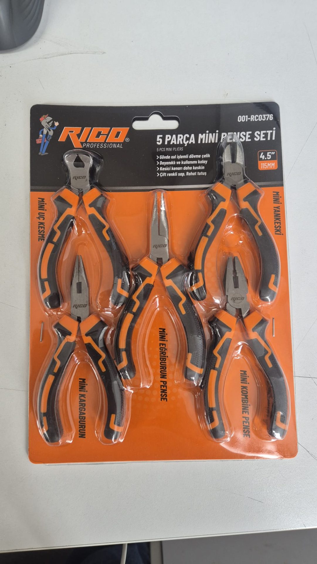 Rico Mini Pense Seti, özellikle elektronik tamirleri, model yapımı, mücevher işleri gibi hassas ve küçük parçalarla uğraştığınız işler için ideal bir araçtır. Bu setler, genellikle kargaburun, yan keski ve düz burun pense gibi temel aletleri içerir.